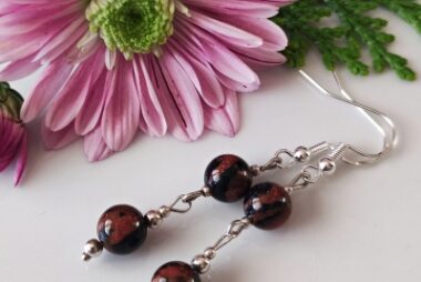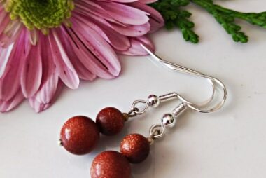 In den glänzenden dunkelroten Goldfluss-Kugeln funkeln unzählige goldfarbene Partikel. Kombiniert sind sie mit einer dunkelgrauen Hämatit-Walze und einem kupferfarbenen Hämatit-Würfel. Eine glänzende Kombination für stilvolle Auftritte. Material: 925er Sterlingsilber, Goldfluss, Hämatit Länge: 4 cm Breiteste Stelle: 0,5 cm Die Perlen und Edelsteine sind Unikate und einzigartig. So können die Farben und Muster leicht vom Bild