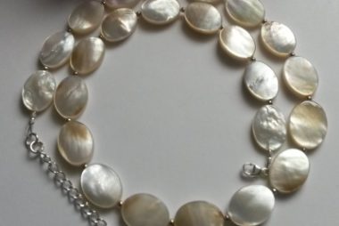 Das festliche Collier mit ovalen Perlmuttmünzen passt perfekt zu Feierlichkeiten wie Hochzeit, Jugendweihe und vielem mehr. Auf der einen Seite schimmern die Münzen Beige bis weiß, auf der anderen Seite erstrahlen sie Milchweiß. Zwischen den Münzen befindet sich jeweils eine kleine silberne Kugel. Zu verschließen ist das Collier mit einem silbernen Karabinerhaken. Die Verlängerungskette gibt